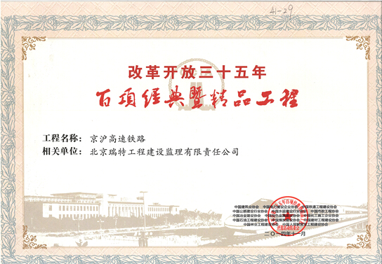 2014年11月28日,我单位监理的“京沪高速铁路”工程项目获得改革开放35年百项经典暨精品工程奖。该奖项由中国建筑业协会会同中国铁道工程建设协会、中国公路建设行业协会、中国市政工程协会、中国水运建设行业协会、中国冶金建设协会、中国石油工程建设协会等13家行业建设协会组织评选。