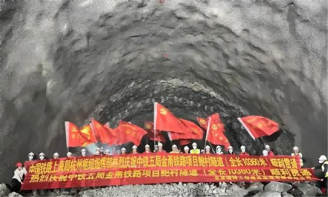 鲍村隧道全长10.36公里,单洞双线,最大埋深512米,隧道穿越6处断层破碎带、9处节理密集带及3处岩溶性接触带,地质复杂多变,且9处穿越水库或溪流,施工难度大,开挖风险高,参建人员克服隧道涌水量大、高地温、高地应力等诸多困难,确保了隧道安全顺利贯通。该隧道的安全顺利贯通,标志着全线45座隧道全部贯通完成,意味着金甬铁路建设取得重大突破。